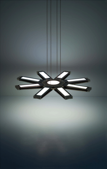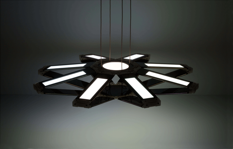Medusa is a foldable OLED pendant lamp. One octagonal OLED, of the type ORBEOS, is connected by joints to eight OLEDS, of the type VEGA. By mirroring this constuction a three dimensional, movable body is created.