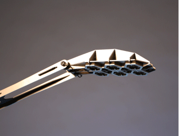 The aesthetics of heat sinks provided the inspiration for MESH. The clear and edgy shape matches the high tech apperance of the LEDs. This way lamp and LEDs appear as a unit. |